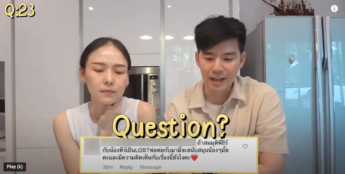 กลายเป็นที่พูดถึงจนติดแฮชแท็กทวิตเตอร์ประเทศไทย กรณีคลิปวิดีโอล่าสุดของคุณพ่อ บีม กวี และคุณแม่ ออย อฏิพรณ์ ที่ออกมาตอบคำถาม Q&A จากแฟน ๆ ผ่านทางยูทูบชาแนล ซึ่งหนึ่งในคำถามมีการกล่าวถึงประเด็นของ LGBTQ รวมอยู่ด้วย โดยระบุในทำนองว่า