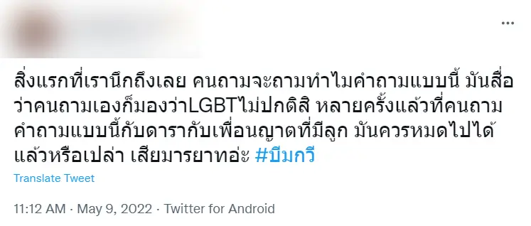 ขณะเดียวกัน ก็มีผู้ใช้งานโซเชียลได้แสดงความคิดเห็นเกี่ยวกับการตั้งคำถามดังกล่าวเช่นกัน โดยบอกว่า ‘สิ่งแรกที่เรานึกถึงเลย คนถามจะถามทำไมคำถามแบบนี้ มันสื่อว่าคนถามเองก็มองว่า LGBTQ ไม่ปกติสิ หลายครั้งแล้วที่คนถามคำถามแบบนี้กับดารา เพื่อน ญาติที่มีลูก มันควรหมดไปได้แล้วหรือเปล่า