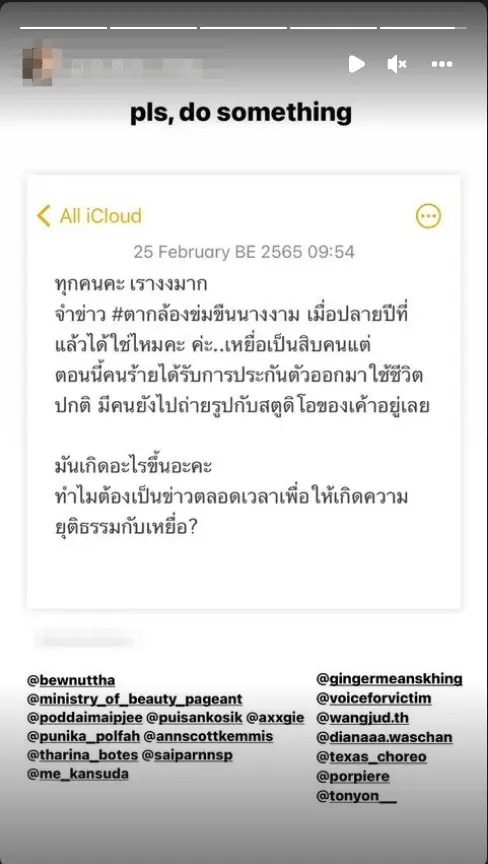 งานนี้เจ้าตัวได้วิงวอนของให้คนที่ได้พบเห็นข้อความของตัวเอง ช่วยกันแชร์ออกไป เพราะตัวเองคิดว่ามันไม่แฟร์ที่จะต้องมีคนตกเป็นเหยื่ออีกครั้งแล้วค่อยเกิดข่าว เจ้าตัวเห็นว่าไม่จำเป็นเลยที่จะต้องรอให้เป็นข่าวก่อนแล้วเหยื่อถึงจะได้รับความยุติธรรม พร้อมกับเรียกร้องให้หน่วยงานที่เกี่ยวข้องและคนในแวดวงนางงาม ออกมาเทคแอคชั่นกับเรื่องนี้