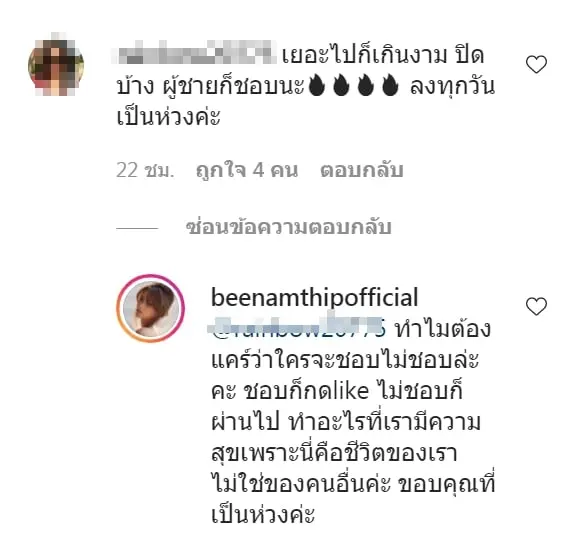 เเต่ล่าสุดเจ้าตัวฟาดกลับ หลังมีคนเข้าคอมเมนต์ว่า “เยอะไปก็เกินงาม ปิดบ้าง ผู้ชายก็ชอบนะ ลงทุกวัน เป็นห่วงค่ะ” บี น้ำทิพย์ ไม่รอช้าได้เข้ามาตอบกลับชาวเน็ตคนดังกล่าวว่า “ทำไมต้องแคร์ว่าใครจะชอบไม่ชอบล่ะคะ ชอบก็กด like ไม่ชอบก็ผ่านไป ทำอะไรที่เรามีความสุขเพราะนี่คือชีวิตของเราไม่ใช่ของคนอื่นค่ะ ขอบคุณที่เป็นห่วงค่ะ”
