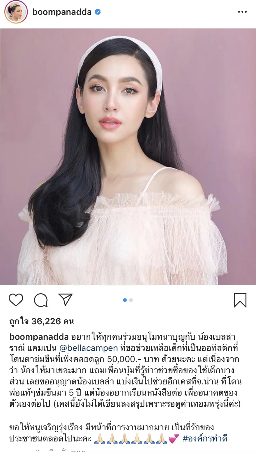 “อยากให้ทุกคนร่วมอนุโมทนาบุญกับ น้องเบลล่า ราณี แคมเปน @bellacampen ที่ขอช่วยเหลือเด็กที่เป็นออทิสติกที่โดนตาข่มขืนที่เพิ่งคลอดลูก 50,000.- บาท ด้วยนะคะ แต่เนื่องจากว่า น้องให้มาเยอะมาก แถมเพื่อนบุ๋มที่รู้ข่าวช่วยซื้อของใช้เด็กบางส่วน เลยขออนุญาตน้องเบลล่า แบ่งเงินไปช่วยอีกเคสที่จ.น่าน ที่โดนพ่อแท้ๆข่มขืนมา 5 ปี แต่น้องอยากเรียนหนังสือต่อ เพื่ออนาคตของตัวเองต่อไป (เคสนี้ยังไม่ได้เขียนลงสรุปเพราะรอดูค่าเทอมพรุ่งนี้ค่ะ)ขอให้หนูเจริญรุ่งเรือง มีหน้าที่การงานมากมาย เป็นที่รักของประชาชนตลอดไปนะคะ ????????????? #องค์กรทำดี