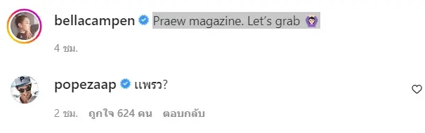 ล่าสุด เบลล่า ราณี ได้มีการโพสต์ภาพคู่กับพระเอกคู่จิ้น อย่าง โป๊ป ธนวรรธน์ พร้อมแคปชั่นว่า Praew magazine. Let’s grab 🙆🏻♀️ ซึ่งเป็นภาพที่ทั้งคู่ถ่ายแม็กกาซีนแพรวด้วยกัน