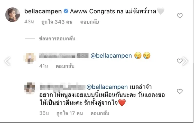 รวมถึงทางด้านของ เบลล่า ราณี ที่มีโอกาสได้ร่วมงานกับทาง ปราง ในเรื่อง บุพเพสันนิวาส ก็เข้ามาร่วมแสดงความยินดีในครั้งนี้ด้วย แต่ทางด้านเบลล่าเอง ก็เพิ่งจะมีข่าวลือว่า ได้เลิกรากับพระเอกหนุ่มอย่าง เวียร์ ศุกลวัฒน์ ไปหมาดๆ หลังจากที่คบกันมานานถึง 9 ปี งานนี้ก็มีแฟนคลับขอเบลล่า เข้าไปคอมเมนต์ต่อว่า อยากเห็นข่าวดีแบบนี้จากฝั่งเบลล่าเหมือนกัน อยากให้ลงเอยแบบนี้ ยังคงรอฟังการแถลงณ์ข่าวจากเบลล่าอยู่ เพราะตั้งแต่มีข่าวลือหลุดออกมา ทั้ง2คนทั้งเวียร์และเบลล่า ก็ยังไม่ได้ออกยืนยันด้วยตัวเองเลย