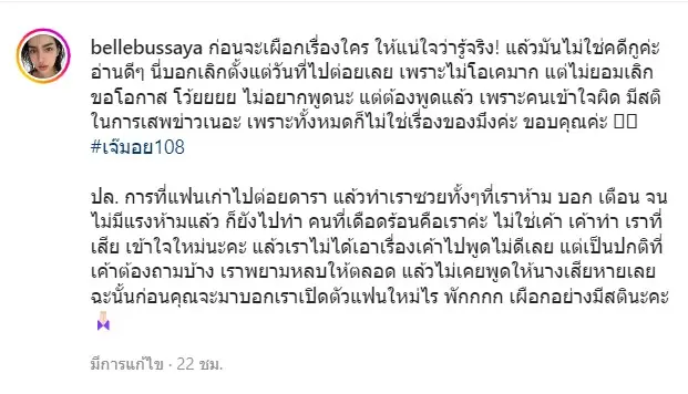 ต่อมา เบล บุษญา ได้ออกมาโพสต์อินสตราแกรมว่า ก่อนจะเผือกเรื่องใคร ให้แน่ใจว่ารู้จริง! แล้วมันไม่ใช่คดีกูค่ะ อ่านดีๆ นี่บอกเลิกตั้งแต่วันที่ไปต่อยเลย เพราะไม่โอเคมาก แต่ไม่ยอมเลิก ขอโอกาส โว้ยยยย ไม่อยากพูดนะ แต่ต้องพูดแล้ว เพราะคนเข้าใจผิด มีสติในการเสพข่าวเนอะ เพราะทั้งหมดก็ไม่ใช่เรื่องของมึงค่ะ ขอบคุณค่ะ #เจ๊มอย108
