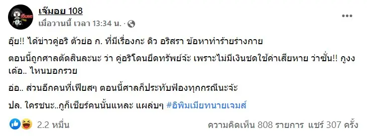 จากกรณีเพจดัง เจ๊มอย108 ออกมาโพสต์ใบ้ว่า อุ๊ย!! ได้ข่าวคู่อริ ตัวย่อ ก. ที่มีเรื่องกะ ดิว อริสรา ข้อหาทำร้ายร่างกาย ตอนนี้ถูกศาลตัดสินละนะ ว่า คู่อริโดนยึดทรัพย์จ้ะ เพราะไม่มีเงินชดใช้ค่าเสียหาย ว่าซั่น!! กูงงเด้อ.. ไหนบอกรวยอ่อ.. ส่วนอีกคนที่เฟียสๆ ตอนนี้ศาลก็ประทับฟ้องทุกกรณีนะจ้ะปล. ใครชนะ..กูก็เชียร์คนนั้นแหละ แผล่บๆ #อิพิมเมียทนายเจมส์