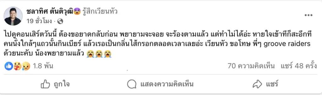 ทำเอาแฟนๆ ขำทั้งสงสาร เมื่อศิลปินคุณภาพเสียงอย่าง “เบน ชลาทิศ” โพสต์ข้อความผ่านเฟซบุ๊กส่วนตัว หลังไปชมคอนเสิร์ตของวง Groove Riders แต่ต้องขอตัวกลับกลางคันเพราะเจอเหตุไม่คาดคิด