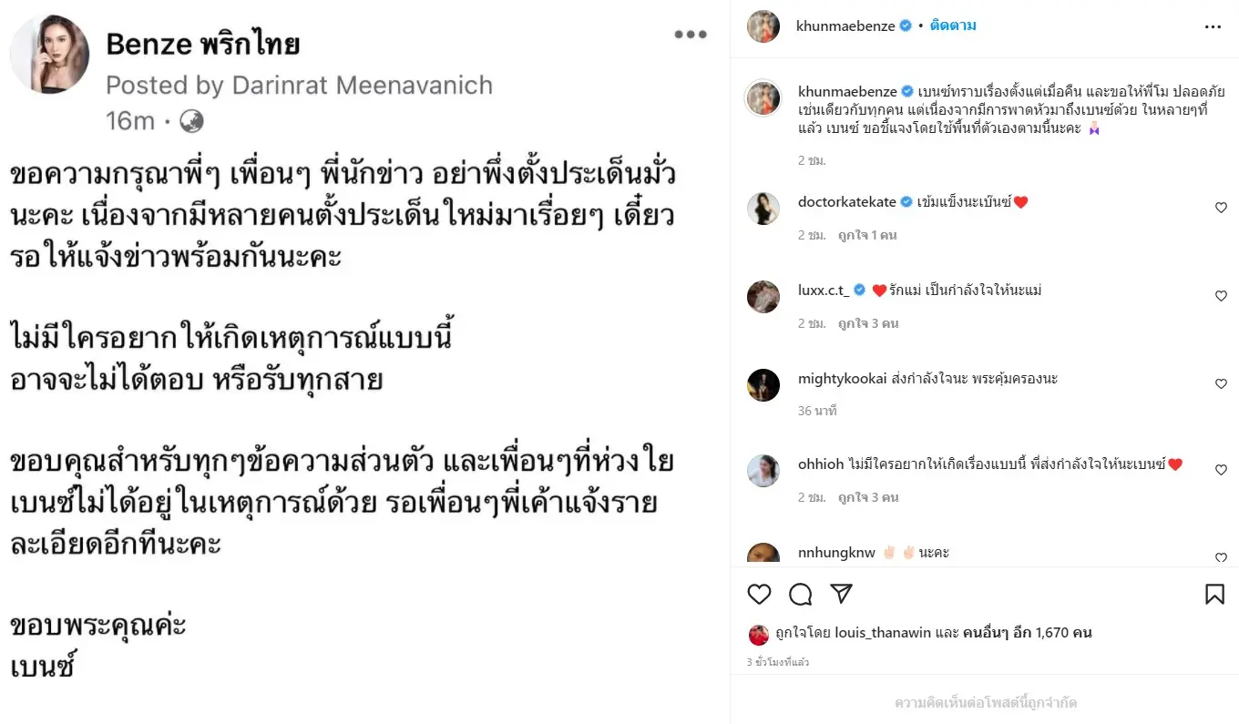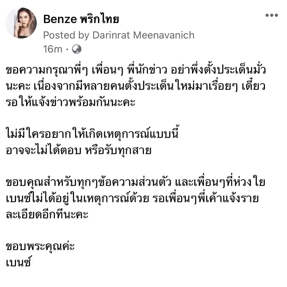 ‘ไม่มีใครอยากให้เกิดเหตุการณ์แบบนี้ อาจจะไม่ได้ตอบ หรือรับทุกสาย ขอบคุณสำหรับทุก ๆ ข้อความส่วนตัว และเพื่อน ๆ ที่ห่วงใย เบนซ์ไม่ได้อยู่ในเหตุการณ์ด้วย รอเพื่อน ๆ พี่เค้าแจ้งรายละเอียดอีกทีนะคะ ขอบพระคุณค่ะ’