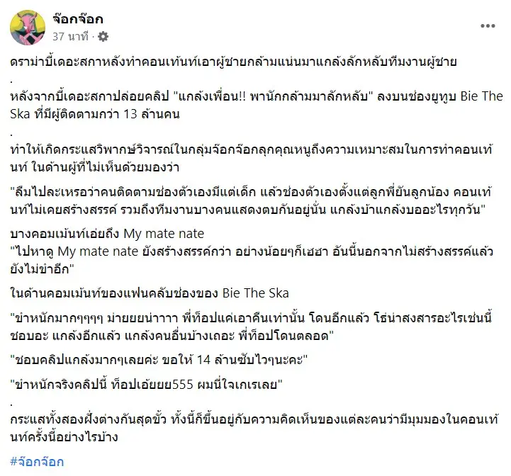 โดนดราม่าอย่างจังสำหรับ บี้เดอะสกา หลังเจ้าตัวปล่อยคอนเทนต์เอาผู้ชายกล้ามแน่น มาแกล้งลักหลับทีมงานผู้ชาย ต่อมาเฟซบุ๊กของ จ๊อกจ๊อก ได้เผยเรื่องราวในกลุ่ม จ๊อกจ๊อกลูกคุณหนู หลังมีคนมองว่าคอนเทนต์ดังกล่าว เหมาะสมหรือไม่ ลืมไปละเหรอว่าคนติดตามช่องตัวเองมีแต่เด็ก แล้วช่องตัวเองตั้งแต่ลูกพี่ยันลูกน้อง คอนเทนต์ไม่เคยสร้างสรรค์ รวมถึงทีมงานบางคนแสดงตบกันอยู่นั่น แกล้งบ้าแกล้งบออะไรทุกวัน”บางคอมเมนต์เอ่ยถึง My mate nate”ไปหาดู My mate nate ยังสร้างสรรค์กว่า อย่างน้อยๆก็เฮฮา อันนี้นอกจากไม่สร้างสรรค์แล้วยังไม่ขำอีก”