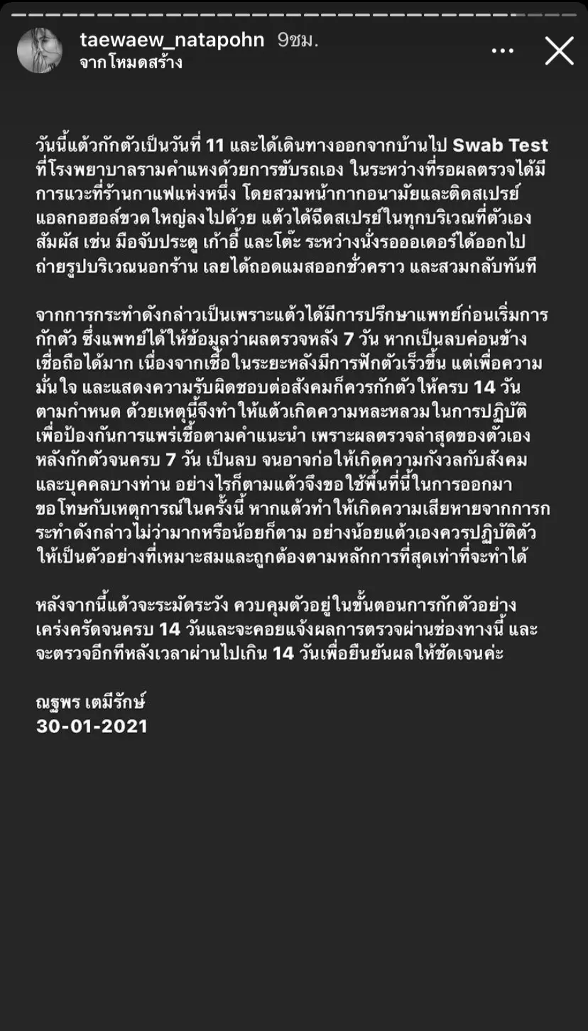 จากกรณีดราม่า ชาวเน็ตลุมจวก แต้ว ณฐพร กักตัวไม่ครบ 14 วัน เนื่องจากเจ้าตัวได้มีการไปตรวจเชื้อโควิด และ ได้แวะซื้อกาแฟ ซึ่งในระหว่างรอ เจ้าตัวได้มีการถ่ายรูปลงทางอินสตาแกรม ทำให้เกิดเสียงวิพากย์วิจารณ์เป็นจำนวนมาก