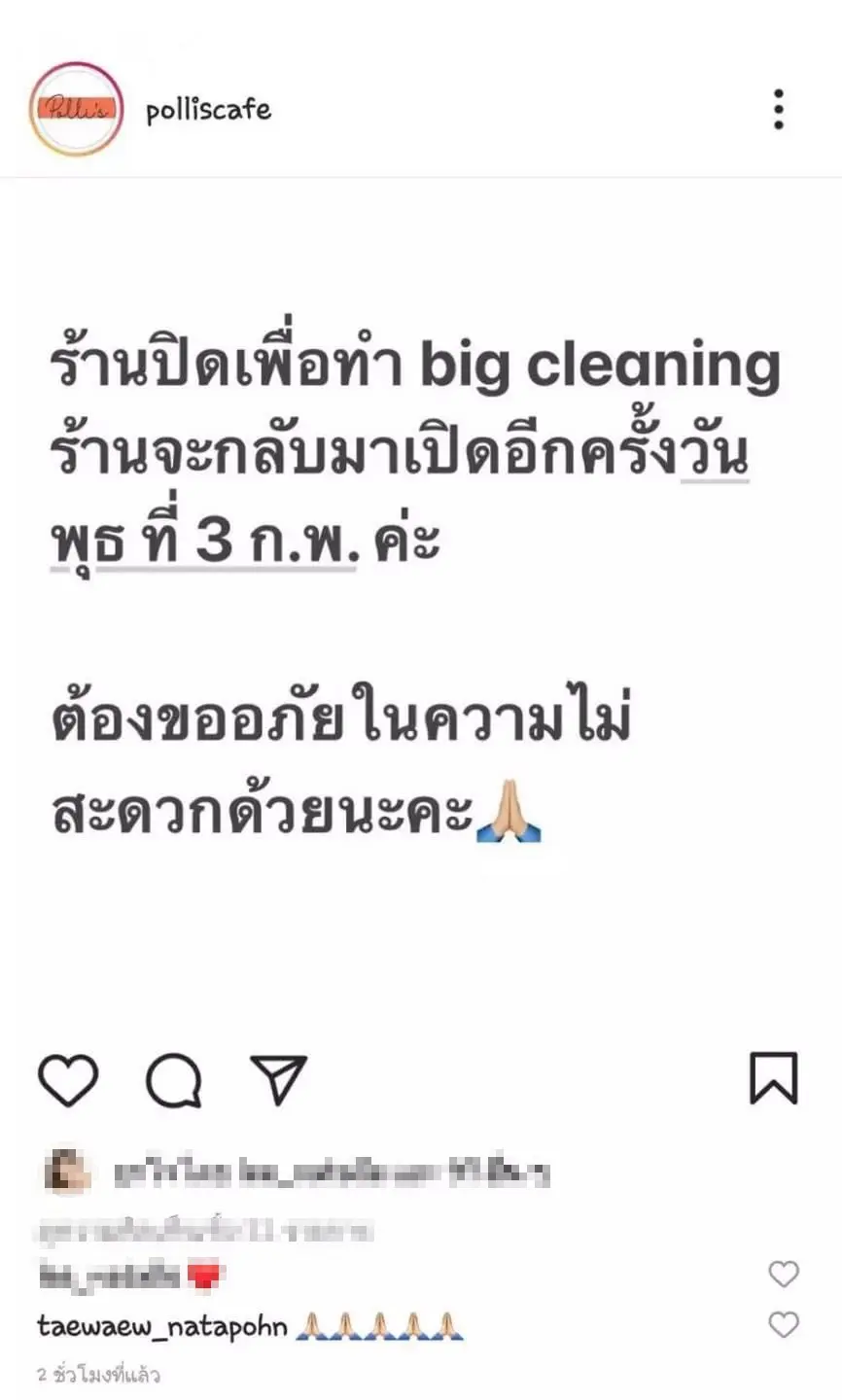 ต่อมาทางร้าน ได้มีการโพสต์ข้อความว่า “ร้านปิดเพื่อทำ big cleaning ร้านจะกลับมาเปิดอีกครั้งวันพุธ ที่ 3 ก.พ. คะ ต้องขออภัย ในความไม่สะดวกด้วยนะคะ”