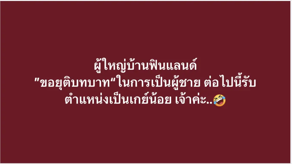 “ผู้ใหญ่บ้านฟินแลนด์ ขอยุติบทบาทในการเป็นผู้ชาย ต่อไปนี้รับตำแหน่งเป็นเกย์น้อย เจ้าค่ะ”