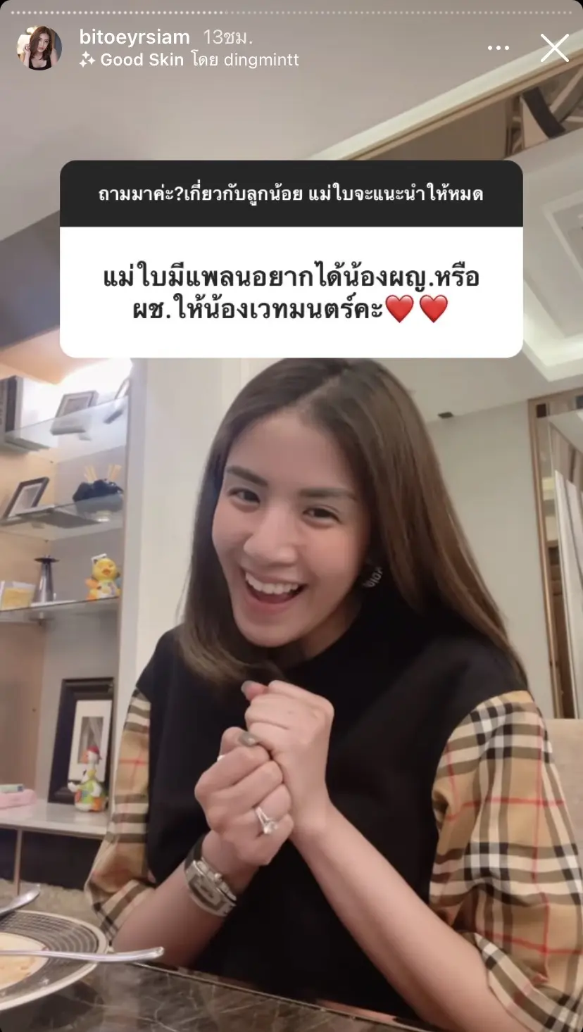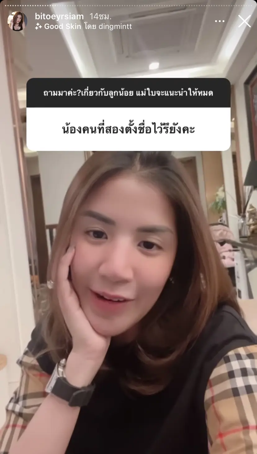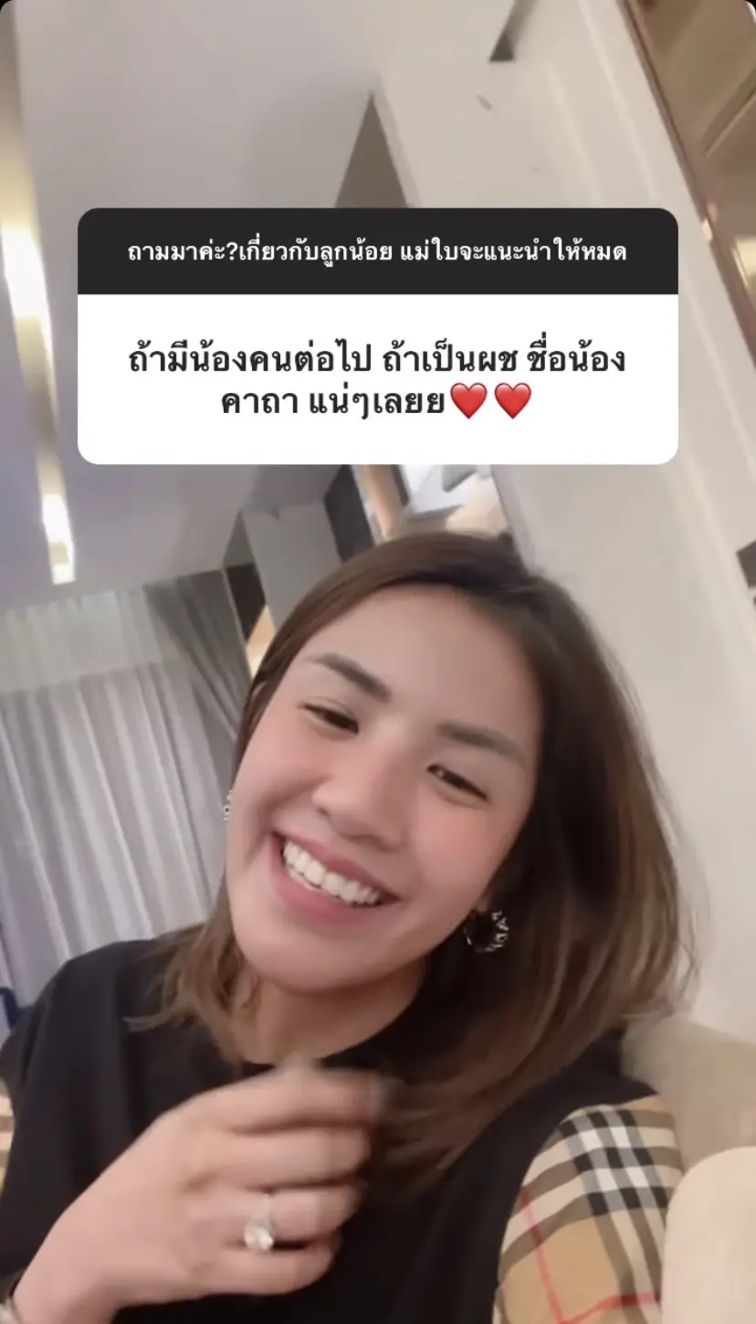 ซึ่งคำตอบก็คือ “คือตั้งใจจะมีช่วงนี้เลยค่ะ เพราะถือว่าเป็นช่วงที่ว่างที่สุดนะคะเหมือนปีที่แล้ว แต่ว่าแม่ใบได้รับละครก็เลยต้องเลื่อนไปเป็นสิ้นปีค่ะ ว่าจะมีตอนธันวาคมแล้วก็จะได้คลอดปีหน้า เพราะว่าหมอดูบอกว่าปีหน้าคลอดแล้วดี”