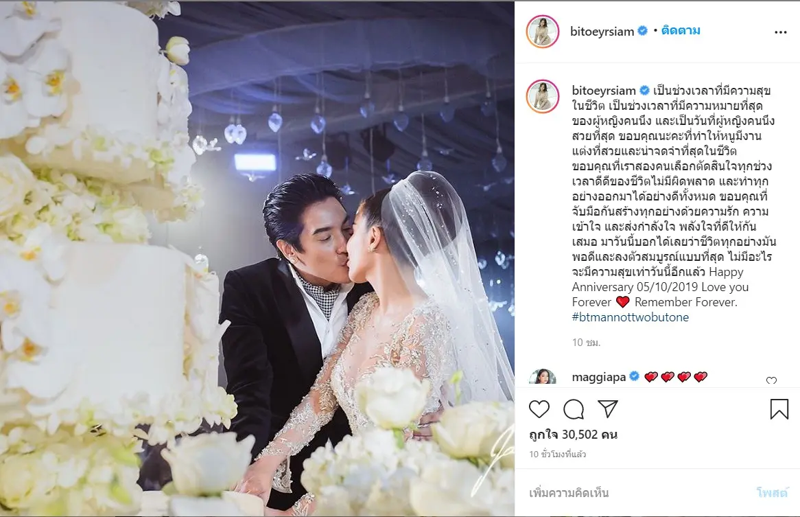 “เป็นช่วงเวลาที่มีความสุขในชีวิต เป็นช่วงเวลาที่มีความหมายที่สุดของผู้หญิงคนนึง และเป็นวันที่ผู้หญิงคนนึงสวยที่สุด ขอบคุณนะคะที่ทำให้หนูมีงานแต่งที่สวยและน่าจดจำที่สุดในชีวิต ขอบคุณที่เราสองคนเลือกตัดสินใจทุกช่วงเวลาดีดีของชีวิตไม่มีผิดพลาด และทำทุกอย่างออกมาได้อย่างดีทั้งหมด ขอบคุณที่จับมือกันสร้างทุกอย่างด้วยความรัก ความเข้าใจ และส่งกำลังใจ พลังใจที่ดีให้กันเสมอ มาวันนี้บอกได้เลยว่าชีวิตทุกอย่างมันพอดีและลงตัวสมบูรณ์แบบที่สุด ไม่มีอะไรจะมีความสุขเท่าวันนี้อีกแล้ว Happy Anniversary 05/10/2019 Love you Forever ❤️ Remember Forever.”