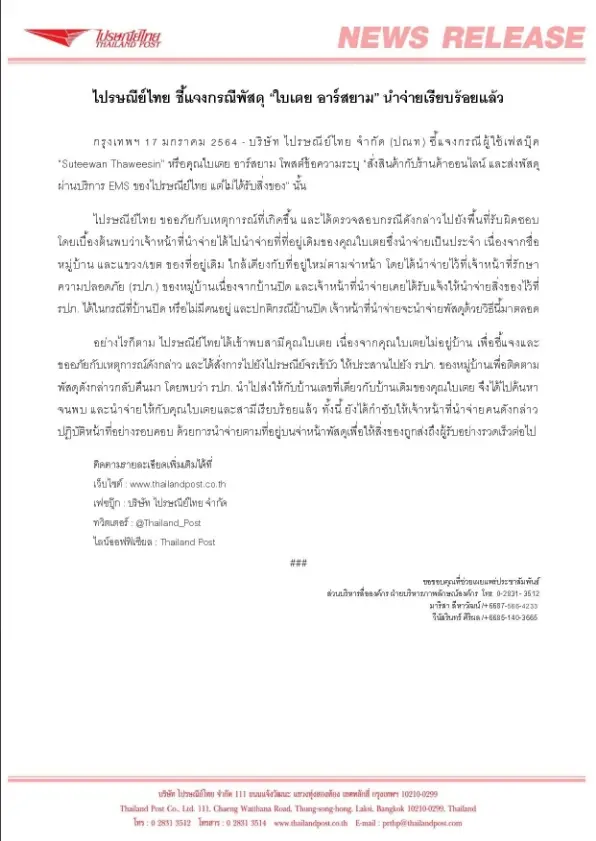 กรุงเทพฯ 17 มกราคม 2564 – บริษัท ไปรษณีย์ไทย จำกัด (ปณท) ชี้แจงกรณีผู้ใช้เฟสบุ๊ค