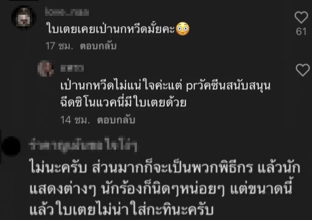 งานนี้ก็ได้มีชาวเน็ตเข้ามาถามทันทีว่า “ใบเตยเคยเป่านกหวีดไหมคะ” ซึ่งชาวเน็ตรายอื่นๆก็ได้มีการเข้ามาตอบกลับข้อความดังกล่าวว่า “เป่านกหวีดไม่แน่ใจค่ะ แต่ pr วัคซีนสนับสนุนฉีดซิโนแวคนี่ มีใบเตยด้วย” , “ไม่นะครับ ส่วนมากก็จะเป็นพวกพิธีกร แล้วนักก็แสดงต่างๆ นักร้องก็นิดๆหน่อยๆ แต่ขนาดนี้แล้ว ใบเตยไม่น่าใส่กะทินะครับ”