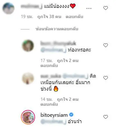 แต่มันยังไม่จบเมื่อมีชาวเน็ตรายหนึ่งเข้ามาคอมเมนต์ว่า แม่มีน้อง จากนั้นก็มีชาวเน็ตคนอื่นๆเข้ามาคอมเมนต์ต่อโพสต์ว่า ท้องหรอคะ คิดเหมือนกันเลยค่ะ อึ๋มมากช่วงนี้ งานนี้สาวใบเตยไม่ปล่อยให้คิดนาน เข้ามาตอบกลับทันทีว่า “อ้วนจ้า” เอาเป็นว่ากระจ่างกันทั้งบาง เลิกสงสัยเพราะแม่อ้วนจ้า