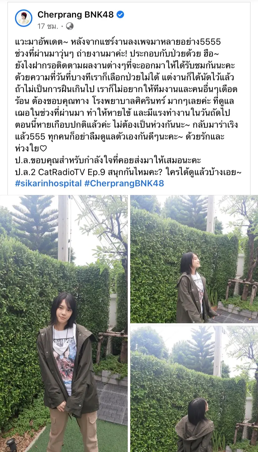 “แวะมาอัพเดต หลังจากแชร์งานลงเพจมาหลายอย่าง5555 ช่วงที่ผ่านมาวุ่นๆ ถ่ายงานมาค่ะ! ประกอบกับป่วยด้วย ฮือ ยังไงฝากรอติดตามผลงานต่างๆที่จะออกมาให้ได้รับชมกันนะคะ ด้วยความที่วันที่บางทีเราก็เลือกป่วยไม่ได้ แต่งานก็ได้นัดไว้แล้ว ถ้าไม่เป็นการฝืนเกินไป เราก็ไม่อยากให้ทีมงานและคนอื่นๆเดือดร้อน ต้องขอบคุณทาง โรงพยาบาลศิครินทร์ มากๆเลยค่ะ ที่ดูแลเฌอในช่วงที่ผ่านมา ทำให้หายไข้ และมีแรงทำงานในวันถัดไป ตอนนี้หายเกือบปกติแล้วค่ะ ไม่ต้องเป็นห่วงกันนะ กลับมาร่าเริงแล้ว555 ทุกคนก็อย่าลืมดูแลตัวเองกันดีๆนะคะ ด้วยรักและห่วงใย ป.ล.ขอบคุณสำหรับกำลังใจที่คอยส่งมาให้เสมอนะคะ ป.ล.2 CatRadioTV Ep.9 สนุกกันไหมคะ? ใครได้ดูแล้วบ้างเอย sikarinhospital #CherprangBNK48”