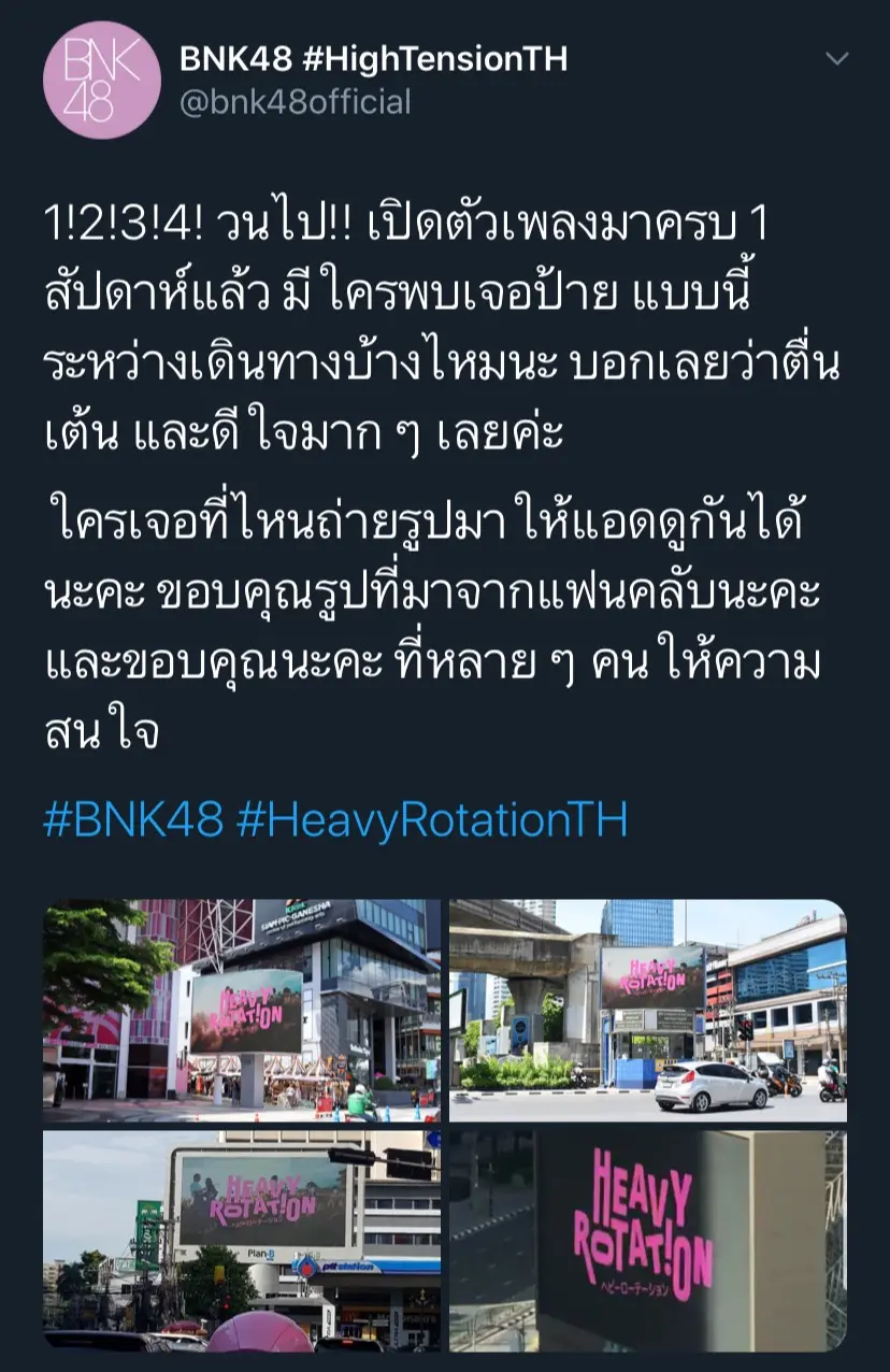 เพจ BNK48 #HighTensionTH เผยภาพป้ายบิลบอร์ด ขนาดใหญ่รอบกรุง !! ซึ่งเป็นภาพโปรโมทซิงเกิ้ลใหม่ของ BNK48 ในชื่อเพลง Hevry rotation โดยเพลงนี้ถือเป็นซิงเกิ้ลที่ 9 ของ BNK48 อีกด้วย โดยเพจ BNK48 #HighTensionTH ได้เผยความปัง !! ก่อนปล่อยซิงเกิ้ลอย่างเป็นทางการในวันที่ 26 กรกฎาคม นี้ เรียกได้ว่านับเป็นการรอคอยที่ตื่นเต้นจนในหัวมีเเต่คำว่า 1! 2! 3! 4! วนไปจ้า !!