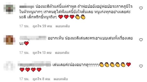 งานนี้ใต้โพสต์ของแม่โบว์ก็มีคนเข้ามาร่วมคอมเมนต์กันมากมาย ต่างก็พากันชมในความน่ารักและความฉลองของน้องมะลิ พร้อมทั้งเตรียมที่จะติดตามผลงานของน้องมะลิกันอีกด้วย