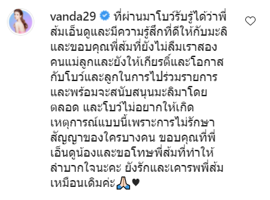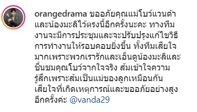 ล่าสุด ทางด้านเจ้าของรายการอย่าง ส้ม ณัชพร สายบัว ก็ได้ออกมาขอโทษแม่โบว์ออกสื่อด้วยเช่นกัน โดยได้มาเขียนลงในไอจีส่วนตัวว่า “ขออภัยคุณแม่โบว์แวนด้าและน้องมะลิไว้ตรงนี้อีกครั้งนะคะ ทางทีมงานจะมีการประชุมและจะปรับปรุงแก้ไขวิธีการทำงานให้รอบคอบยิ่งขึ้น ทั้งทีมเสียใจมากเพราะพวกเรารักและเอ็นดูน้องมะลิและชื่นชมคุณโบว์จากใจจริง ส้มเข้าใจความรู้สึกเพราะส้มเป็นแม่ของลูกเหมือนกัน เสียใจที่เกิดเหตุการณ์และขออภัยอย่างสูงอีกครั้งค่ะ @vanda29”