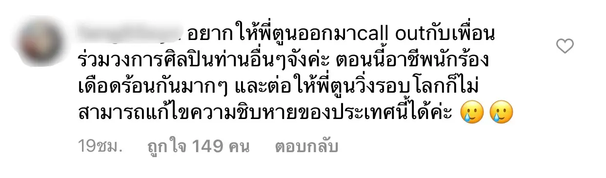 ซึ่งก็มีเหล่าแฟนคลับต่างชื่นชมเหล่าศิลปินที่ตนชื่นชอบได้ออกมาแสดงจุดยืนและเรียกร้องสิทธิของตนเองกันอย่างถูกต้อง แต่แล้วก็เกิดความผิดหวังจนได้ เมื่อแฟนคลับของ ตูน บอดี้สแลม ต่างพากันเรียกร้องให้ออกมาเคลื่อนไหวบ้าง จนทำให้เหล่าแฟนคลับทนไม่ไหว ได้ทำการเข้าไปวิจารณ์ ตูน บอดี้สแลม กันเป็นจำนวนมากใน Instagram ส่วนตัว