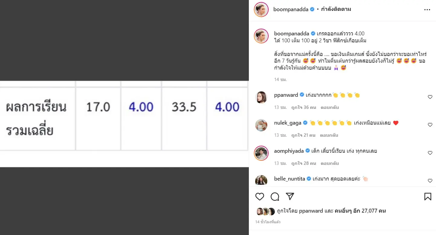 เกรดออกแล้วววว 4.00 ได้ 100 เต็ม 100 อยู่ 2 วิชา ฟิสิกซ์เกือบเต็ม สิ่งที่ขอจากแม่ครั้งนี้คือ …. ขอเงินเติมเกมส์ ซึ่งยังไม่บอกว่าจะขอเท่าไหร่ อีก 7 วันรู้กัน 😅😅 ทำไมตื่นเต้นกว่ารู้ผลสอบยังไงก็ไม่รู้ 😅😅😅 ขอกำลังใจให้แม่ด้วยค้าบบบบ 🙏🏻😅 งานนี้เพื่อนพ้องในวงการบันเทิงเข้ามาคอมเมนต์อย่างมากมาย อาทิ เป้ย ปานวาด , หนูเล็กก่อนบ่าย อ้อม พิยดา , ตุ๊กกี้ สุดารัตน์ และอีกมากมาย
