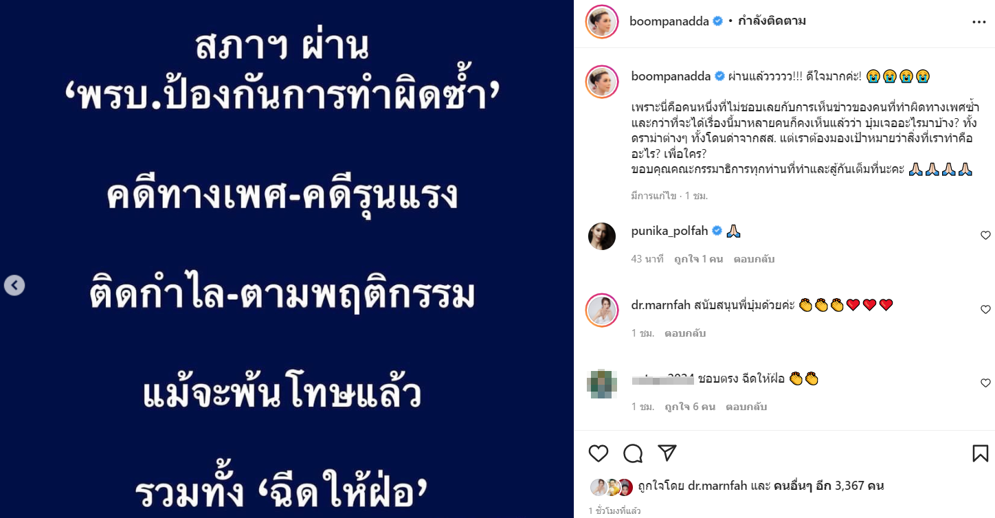ล่าสุด พ.ร.บ.ป้องกันผิดซ้ำคดีเกี่ยวกับเพศ-ความรุนแรงฯ ผ่านเป็นที่เรียบร้อย เจ้าตัวโพสต์ข้อความในไอจีว่า ผ่านแล้ววววว!!! ดีใจมากค่ะ! 😭😭😭😭 เพราะนี่คือคนหนึ่งที่ไม่ชอบเลยกับการเห็นข่าวของคนที่ทำผิดทางเพศซ้ำ และกว่าที่จะได้เรื่องนี้มาหลายคนก็คงเห็นแล้วว่า บุ๋มเจออะไรมาบ้าง? ทั้งดราม่าต่างๆ ทั้งโดนด่าจากสส. แต่เราต้องมองเป้าหมายว่าสิ่งที่เราทำคืออะไร? เพื่อใคร? ขอบคุณคณะกรรมาธิการทุกท่านที่ทำและสู้กันเต็มที่นะคะ
