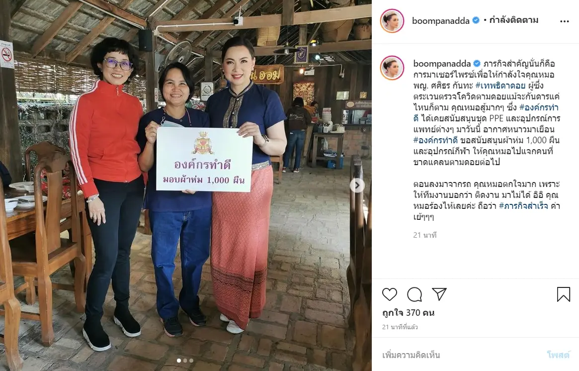 โดยสาวบุ๋ม ก็ได้โพสต์ภาพตนเองถ่ายคู่กับคุณหมอ พญ. ศศิธร กันทะ เทพธิดาดอย พร้อมแคปชั่น ‘ภารกิจสำคัญนั่นก็คือ การมาเซอร์ไพรซ์เพื่อให้กำลังใจคุณหมอ พญ. ศศิธร กันทะ #เทพธิดาดอย ผู้ซึ่งตระเวนตรวจโควิดตามดอยแม้จะกันดารแค่ไหนก็ตาม คุณหมอสู้มากๆ ซึ่ง #องค์กรทำดี ได้เคยสนับสนุนชุด PPE และอุปกรณ์การแพทย์ต่างๆ มาวันนี้ อากาศหนาวมาเยือน #องค์กรทำดี ขอสนับสนุนผ้าห่ม 1,000 ผืน และอุปกรณ์กีฬา ให้คุณหมอไปแจกคนที่ขาดแคลนตามดอยต่อไป