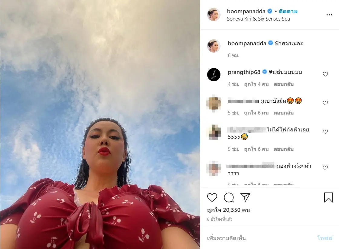 โดยล่าสุด บุ๋ม ได้ออกมาโพสต์ภาพที่เรียกได้ว่าไม่ได้เซ็กซี่มากมายอะไร แต่ชาวเน็ตก็ต้องร้องว้าวมากแม่ เพราะภาพที่โพสต์นั้น เป็นภาพมุมเสยขึ้นมาจากด้านล่างเพื่อให้เห็นท้องฟ้า แต่เพราะเป็นมุมเสยจึงทำให้เห็นหน้าอกของคุณแม่คนสวย ที่เรียกได้ว่าเซ็กซี่นิดๆ พอเป็นพิธี หลังจากนั้นก็มี FC เข้ามาคอมเมนต์แห่แซวบุ๋มกันยกใหญ่ว่า “ไม่ได้โฟกัสท้องฟ้าเลย”