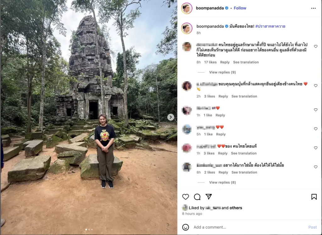 ล่าสุด (24 ก.ค. 2568) หลังเกิดเหตุปะทะระหว่างทหารไทย-กัมพูชา จนมีผู้บาดเจ็บและเสียชีวิตหลายราย แม่บุ๋มไม่รอช้า ออกมาโพสต์แสดงจุดยืนผ่านอินสตาแกรมส่วนตัว @boompanadda พร้อมภาพที่เคยลงพื้นที่จริง และแคปชั่นสั้น ๆ แต่ชัดเจนว่า
