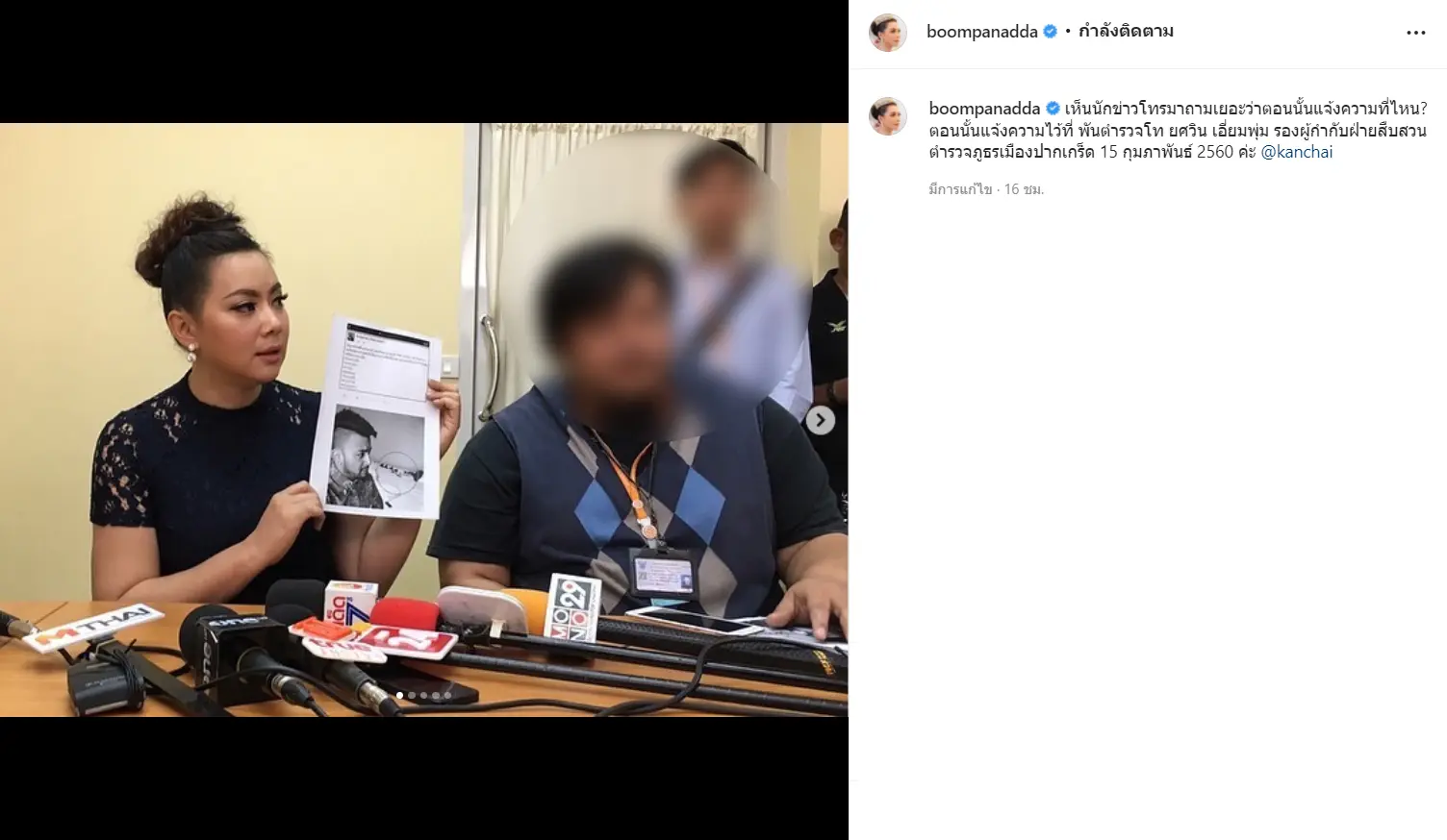 ‘ตอนนั้นบุ๋มแจ้งความไว้ที่พันตำรวจโท ยศวิน เอี่ยมพุ่ม รองผู้กำกับฝ่ายสืบสวน ตำรวจภูธรเมืองปากเกร็ดค่ะ บุคคลนี้เป็นภัยสังคมและเป็นบุคคลอันตราย ประชาชนอย่าไปหลงเชื่อนะคะ‘