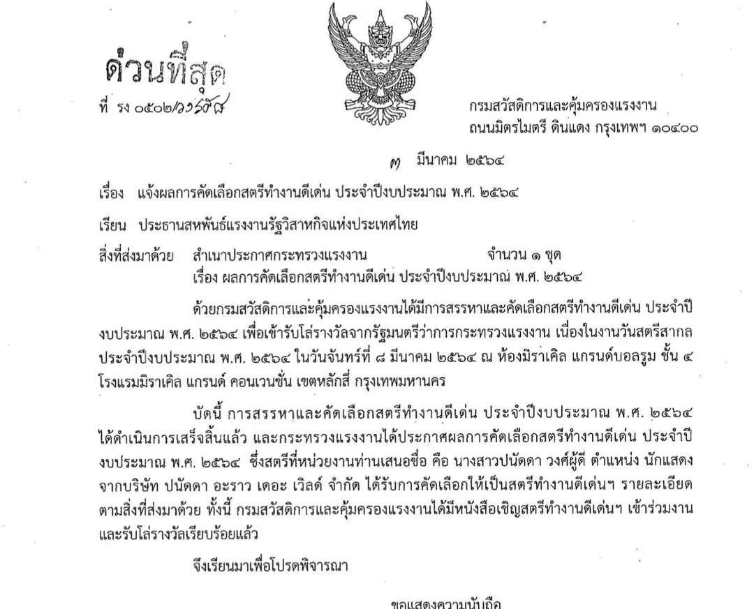 โดยเมื่อวันที่ 7 มีนาคม แม่บุ๋มก็ได้ออกมาโพสต์ผ่านทางอินสตาแกรมส่วนตัวเป็นการแจ้งข่าวดีว่าตนเองได้นรับจดหมายจากทางราชการ พร้อมแคปชั่นว่า “รางวัลสตรีทำงานดีเด่น ปี2564 น้ำตาไหลดีใจมากๆค่ะ เพราะต้องผ่านการคัดเลือกจากผู้หญิงเก่งทั้งประเทศ ไม่นึกว่าจะได้กับเค้า โอ๊ย! ขอนั่งร้องไห้แปป ขอบคุณ ขอบคุณจริงๆค่ะ”