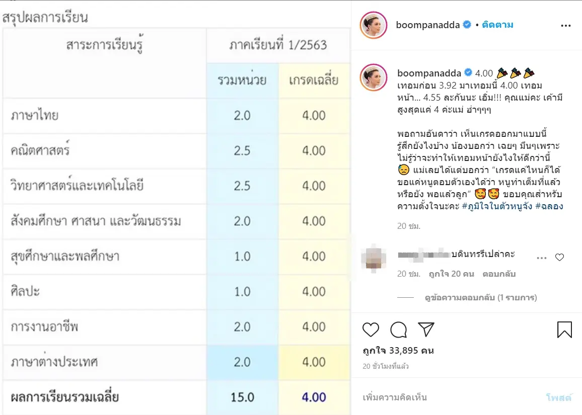โดยล่าสุดเมื่อวันที่ 18 พ.ย.63 บุ๋ม ได้ออกมาโพสต์ภาพผลการเรียนของลูกสาวคนสวยของเธอ พร้อมระบุแคั่นว่า “ได้รับการตรวจสอบแล้ว