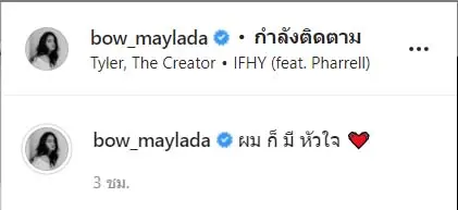 จนล่าสุด สาวโบว์เองก็ได้โพสต์คลิปวิดีโอที่เหมือนจะส่งสัญญาณบอกอะไรบางอย่างหรือเปล่า ว่าตอนนี้หัวใจอาจจะไม่ได้ว่างแล้วก็ได้ เพราะเจ้าตัวเองเล่นทำผมเป็นหัวใจ อัปเป็นคลิปวิดีโอสุดน่ารัก พร้อมกับเพลงประกอบที่สื่อถึงคนกำลังอินเลิฟ บวกกับแคปชั่น “ผมก็มีหัวใจ” ทำเอาชาวเน็ตหลายๆคนต่างก็เข้ารุมกดไลค์ให้กับความน่ารักของเจ้าตัว พร้อมทั้งคอมเมนต์ถามด้วยว่า คลิปวิดีโอสื่อถึงใครหรือเปล่า รวมถึงทางด้านของแฟนคลับคู่จิ้น อาเล็ก-โบว์ เข้ามาแท็กชื่อไอจีของอาเล็กในโพสต์นี้ด้วย