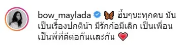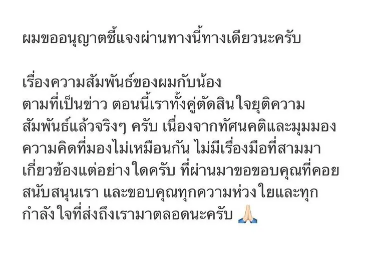 ล่าสุด ด้านอินสตาแกรมของฝ่ายหญิงได้มีการเคลื่อนไหวอีกครั้ง ด้วยการโพสต์ภาพใบหน้าอันสดใสที่กำลังยิ้มอยู่ พร้อมระบุข้อความว่า 🦋 ฮึ้บๆนะทุกคน มันเป็นเรื่องปกติน้า มีรักก็มีเลิก เป็นเพื่อนเป็นพี่ที่ดีต่อกันเเละกัน 💗