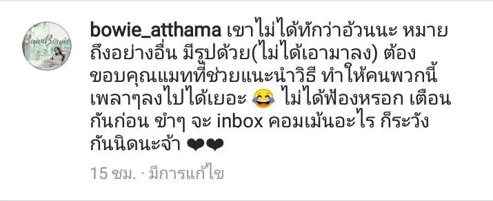 ทั้งนี้ “โบวี่ อัฐมา” ก็ยังได้เผยแคปชั่นบอกว่า… “เขาไม่ได้ทักว่าอ้วนนะ หมายถึงอย่างอื่น มีรูปด้วย(ไม่ได้เอามาลง) ต้องขอบคุณแมทที่ช่วยแนะนำวิธี ทำให้คนพวกนี้เพลาๆ ลงไปได้เยอะ ไม่ได้ฟ้องหรอก เตือนกันก่อน ขำๆ จะ inbox คอมเมนต์อะไร ก็ระวังกันนิดนะจ๊ะ”