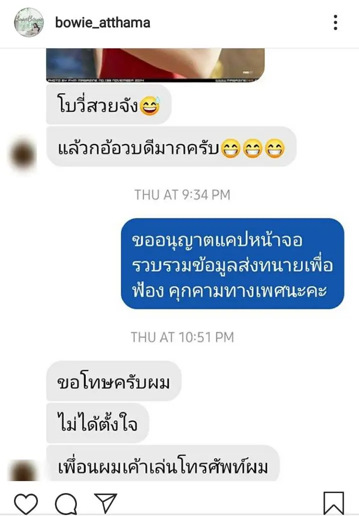 โดยสาวโบวี่ก็ได้ออกมาโพสต์ภาพแชตข้อความที่ชาวเน็ตได้ส่งข้อความมา แต่เมื่อสาโบวี่ตอบกลับไไปว่าจะรวบรวมข้อมูลเพื่อส่งทนายให้ฟ้องข้อหาคุกคามทางเพศ ทางฝั่งนั้นก็รีบแก้ตัวโดยบอกว่า “ขอโทษครับผม ไม่ได้ตั้งใจ เพื่อนผมเค้าเล่นโทรศัพท์ผม”