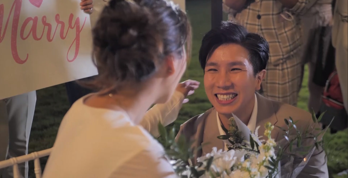 ‘ตัวเล็ก เราก็คบกันมาสักพักหนึ่งแล้ว จะขอโอกาสละกัน สัญญาว่าจะดูแลตัวเล็กให้ดีที่สุด เราจะเดินไปทั้งทางโลกและทางธรรมด้วยกันนะครับ บางคำที่ปูไม่เคยได้พูดไป ปูก็อยากจะพูดวันนี้นะครับว่า ปูรักโบนะ แต่งงานกันนะ‘ สิ้นสุดวาจาจากใจ ฝ่ายชายก็ได้หยิบแหวนออกมาจากกระเป๋าเสื้อพร้อมกับคุกเข่าขอสาวโบวี่แต่งงาน ท่ามกลางเสียงปรบมือและคำอวยพรยินดีจากเพื่อน ๆ ในงาน