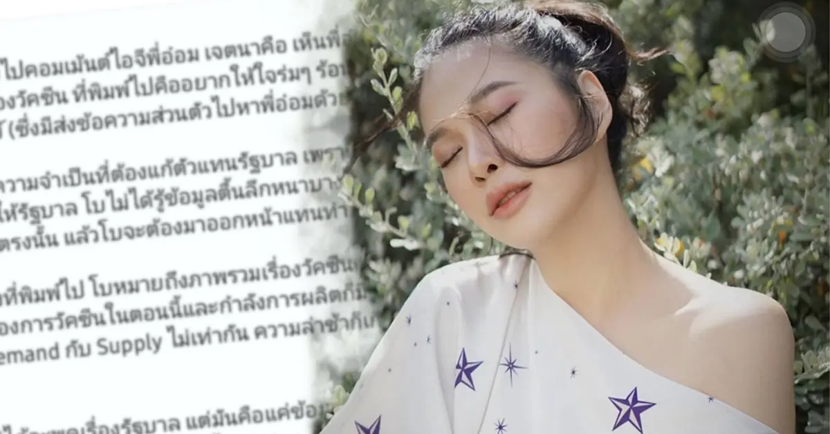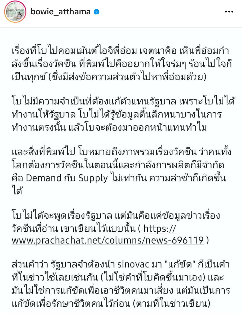 “เรื่องที่โบไปคอมเม้นต์ไอจีพี่อ๋อม เจตนาคือ เห็นพี่อ๋อมกำลังขึ้นเรื่องวัคซีน ที่พิมพ์ไปคืออยากให้ใจร่มๆ ร้อนไปใจก็เป็นทุกข์ (ซึ่งมีส่งข้อความส่วนตัวไปหาพี่อ๋อมด้วย)โบไม่มีความจำเป็นที่ต้องแก้ตัวแทนรัฐบาล เพราะโบไม่ได้ทำงานให้รัฐบาล โบไม่ได้รู้ข้อมูลตื้นลึกหนาบางในการทำงานตรงนั้น แล้วโบจะต้องมาออกหน้าแทนทำไมและสิ่งที่พิมพ์ไป โบหมายถึงภาพรวมเรื่องวัคซีน ว่าคนทั้งโลกต้องการวัคซีนในตอนนี้และกำลังการผลิตก็มีจำกัดคือ Demand กับ Supply ไม่เท่ากัน ความล่าช้าก็เกิดขึ้นได้โบไม่ได้จะพูดเรื่องรัฐบาล แต่มันคือแค่ข้อมูลข่าวเรื่องวัคซีนที่อ่าน เขาเขียนไว้แบบนั้น ( http:/!www.prachachat.net/columns/news-696119)ส่วนคำว่า รัฐบาลจำต้องนำ sinovac มา “แก้ขัด” ก็เป็นคำที่ในข่าวใช้เลยเช่นกัน (ไม่ใช่คำที่โบคิดขึ้นมาเอง) และมันไม่ใช่การแก้ขัดเพื่อเอาชีวิตคนมาเสี่ยง แต่มันเป็นการแก้ขัดเพื่อรักษาชีวิตคนไว้ก่อน (ตามที่ในข่าวเขียน)โบเข้าใจว่าตอนนี้ทุกคนกำลังร้อน และก็เข้าใจได้ถ้าจะเข้าใจผิดและไม่พอใจ โบต้องขอโทษที่ทำให้ทุกคนร้อนไปกว่าเดิมอีก ทั้งที่เจตนาที่แท้จริงคืออยากให้ใจเย็นๆกันปัญหาหนักอยู่แล้ว ความโกรธยิ่งทำให้ใจเป็นทุกข์ และอาจจะไม่ได้ช่วยให้ปัญหาดีขึ้นค่ะต้องขอโทษพี่อ่อมด้วยจริงๆ ที่ทำให้เป็นข่าวแบบนี้ค่ะ)”