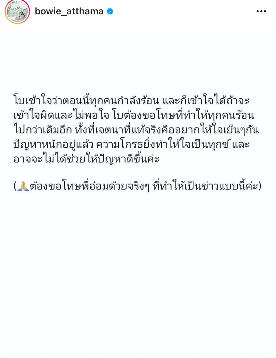ล่าสุด โบวี่ อัฐมา ก็ได้ออกมาเคลื่อนไหวผ่าน Instagram ของเธอว่า