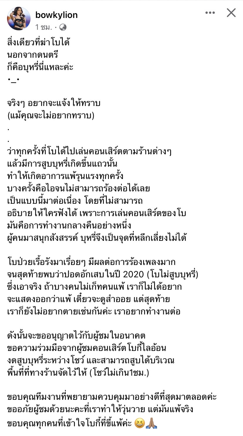 โบกี้ ไลอ้อน นักร้องชื่อดัง แจ้งข่าวป่วยปอดอักเสบเรื้อรังนานกว่า 2 ปี เหตุแพ้ควันบุหรี่หนัก จากการทำงานร้องเพลงกลางคืน ลั่น! ยังไม่อยากตาย แต่ก็เลี่ยงไม่ได้ วอนเห็นใจ อดสูบบุหรี่เวลาขึ้นร้องเพลง
