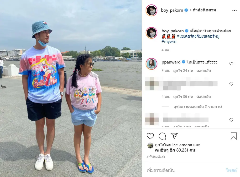 ล่าสุด หนุ่มบอยก็แสดงอาการเห่อน้องวันใหม่อีกครั้ง ด้วยการโพสต์รูปคู่ แต่บอกไว้ก่อนเลยว่านี่ไม่ใช่รูปคู่ธรรมดา เพราะเสื้อที่หนุ่มบอยใส่คู่กับน้องปีใหม่นั้น เป็นลายการ์ตูนในตำนานอย่าง ตัวแทนแห่งดวงจันทร์ จะลงทัณฑ์แกเอง ‘เซเลอร์มูน’ สีพาสเทลชมพูฟ้าน่ารักไปหนึ่งแมตช์ พร้อมแคปชั่น ‘เสื้อคู่เอาใจคุณเค้าหน่อย ?????? #เซเลอร์ลุงกับเซเลอร์หมู #mywm’