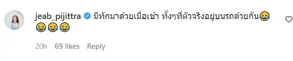 และยิ่งพีคไปกว่านั้นเมื่อภรรยาสาวคนสวยอย่าง เจี๊ยบ พิจิตตรา ได้เข้ามาคอมเมนต์ชวนขมับ หลังเจ้าตัวได้เผยว่า มีทักมาด้วยเมื่อเช้า ทั้งๆที่ตัวจริงอยู่บนรถด้วยกัน เรียกได้ว่างานนี้ทำเอาหลายคนถึงกับงงไปพร้อมกัน และเข้ามาคอมเมนต์ว่าถูกทักมาอีกด้วย