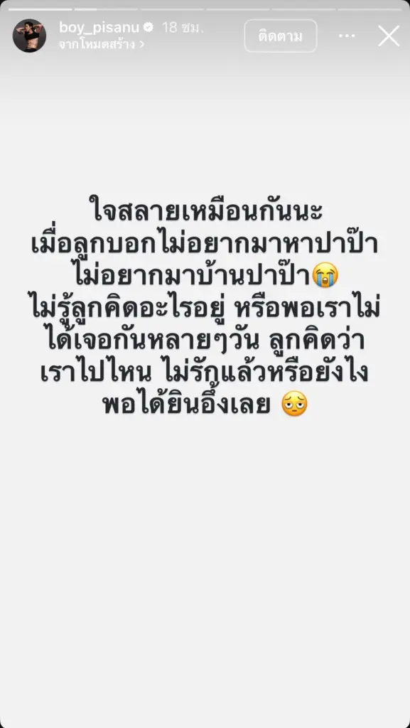 ทำเอาแฟน ๆ ใจหายไปตาม ๆ กัน เมื่อนักแสดงและพิธีกรอารมณ์ดี บอย พิษณุ นิ่มสกุล ออกมาโพสต์ข้อความสะเทือนใจ หลังถูกลูกสาวสุดที่รักอย่าง น้องเฟรย่า พูดตรง ๆ ว่า ไม่อยากมาหา ไม่อยากมาบ้านปาป๊า ภายหลังการยุติความสัมพันธ์กับอดีตภรรยาชาวสวีเดน อแมนดา เพอร์สสัน