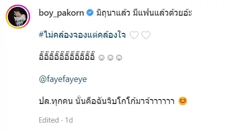 ซึ่ง บอย ปกรณ์ ได้ออกมาบอกสถานะความรักแบบชัดเจนกับสาวเฟย์ พร้อมตั้งแคปชั่นมดขึ้นแบบชวนเขิน แนบมาด้วยรูปดึงแก้มสาว เฟย์ งานนี้ใครจะอดใจแซวไหว พร้อมแคปชั่นว่า มิถุนาแล้ว มีแฟนแล้วด้วยอ้ะ