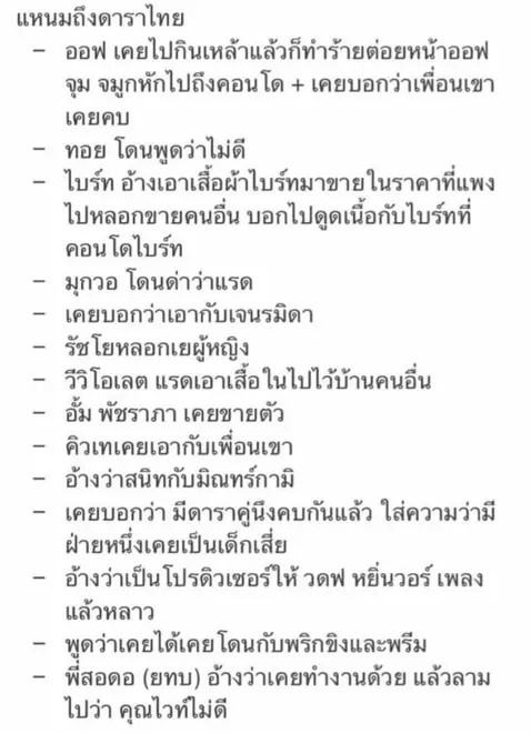 – ไบร์ท อ้างเอาเสื้อผ้าไบร์ทมาขายในราคาที่แพงไปหลอกขายคนอื่น บอกไปดูดเนื้อกับไบร์ทที่คอนโดไบร์ท