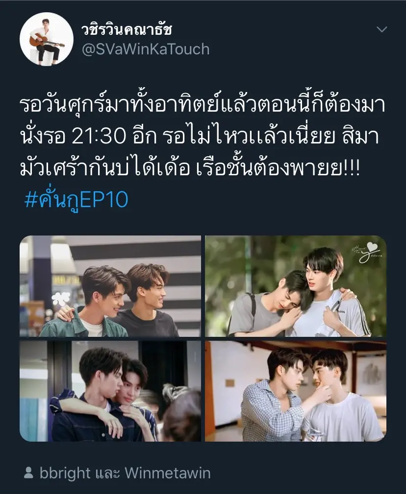 ไบร์ท – วิน ไบร์ท วชิรวิชญ์ และ วิน เมธวิน นักแสดงจาก ซีรีส์เรื่อง เพราะเราคู่กัน 2gether The Series ที่บอกเลยว่าทำเอาเทรนด์ทวิตเตอร์แตกแต่เช้า เพราะว่าแฟนๆต่างร้องเป็นเสียงเดียวกันว่า EP.9 สนุกแล้ว รอไม่ไหวแล้วสำหรับ EP.10 จึงต่างพากันทวิตเตอร์ พร้อมติดแฮชแท็ก #คั่นกูEP10 งานนี้บอกเลยว่า อยากให้ถึงเวลาซีรีส์ออนแอร์สักที ใจจะขาเเเล้วโว้ยยยยยยย
