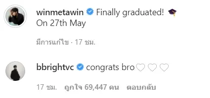 ไบร์ท วชิรวิชญ์ คอมเมนต์แสดงความยินดี วิน เมธวิน หลังโพสต์ภาพสวมชุดครุย พร้อมแจ้งกำหนดการรับปริญญาวันที่ 27 พฤษภาคม 2565 ที่กำลังจะถึงนี้