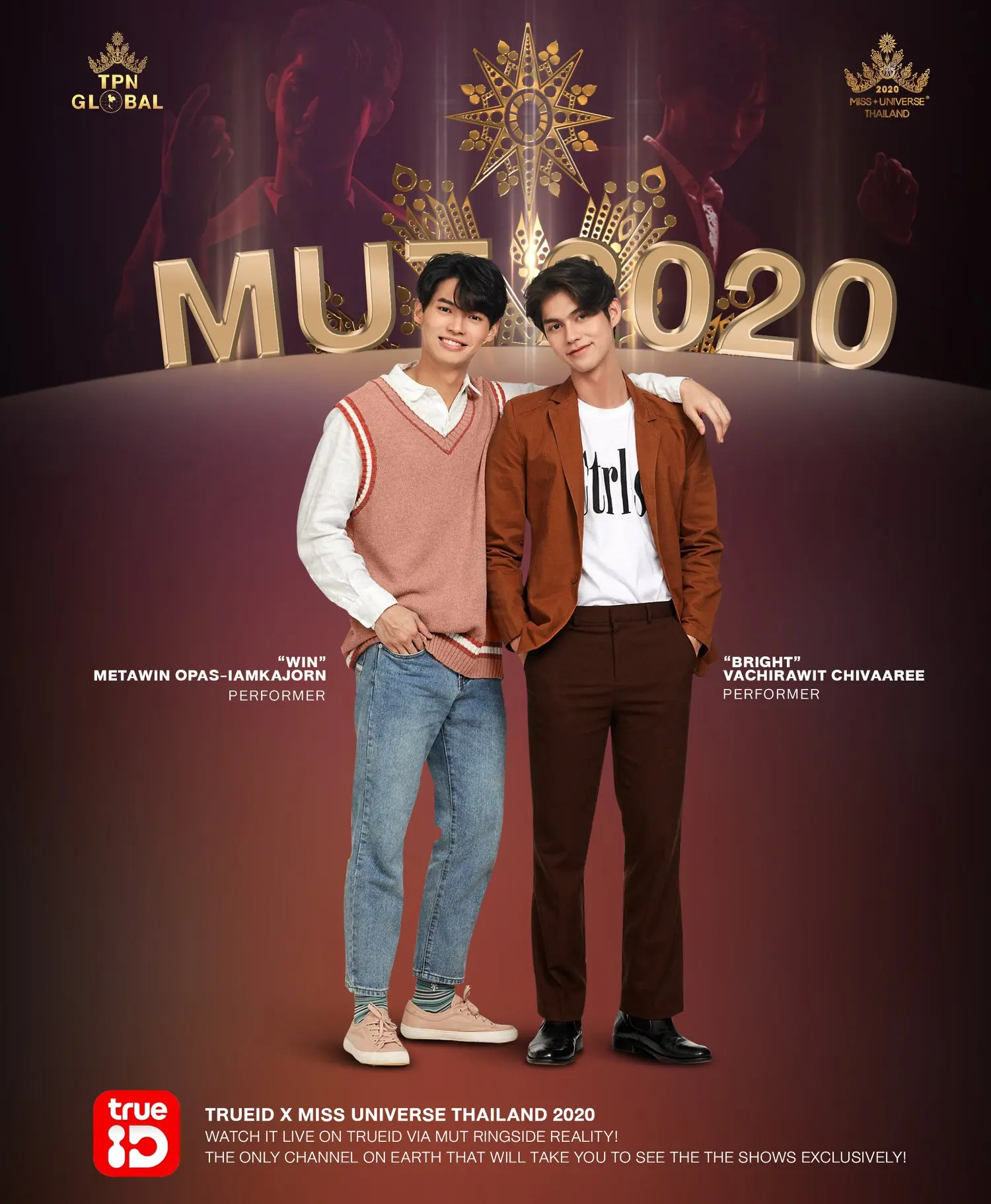 ซึ่งแฟนๆจะได้ดูกันสดๆ แบบครบทุกการแสดงของ ไบร์ท วิน โดยทาง TrueID ได้จัดแพ็กเกจรับชมการถ่ายทอดสด พร้อม Exclusive Content ที่ TrueID ทางช่อง MUT Ringside Reality ที่เดียวในโลกที่คุณจะได้เห็น การประกวดทั้งเบื้องหน้าเวทีสุดอลังการ แบบมอง Ringside และเบื้องหลังการเวทีการประกวด ของเหล่าสาวงาม แบบ Reality ด้วยการซื้อแพ็กเกจทาง “ทรูไอดี” ในราคา 349.- บาท (ราคารวมภาษีมูลค่าเพิ่ม) รับชมได้ที่ทรูไอดี ทั้งแอป เว็บ และกล่องทรูไอดี ทีวี