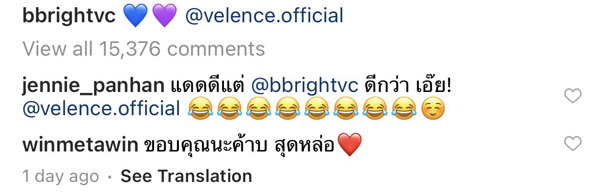 ก่อนจะทำเอาแฟนคลับแตกแตนอีกครั้ง เพราะเจ้าของแบรนด์อย่างหนุ่ม วิน เมธวิน คู่จิ้นคู่ฟินของหนุ่มไบร์ทมาคอมเมนท์เองว่า “ขอบคุณนะค้าบ สุดหล่อ” พร้อมอิโมจิหัวใจสีแดง ทำเอาฟิน กันไปเป็นแถว ๆ